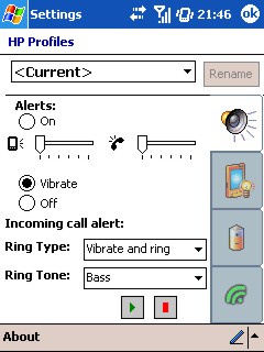 Integriert im 6340 ist die vom Mobiletelefon bekannte, aber bisher auf PPCPE-Geräten gerne ignorierte Profil-Funktion, also die Definition von Klingellautstärke, Alarmen, Vibration, etc. für einzelne Anwendungen (draussen, wo alles lauter sein muss, in einem Meeting, wo alles möglichst stumm sein sollte, etc.). HP hat mit HP Profiles allerdings dazu noch die kompletten Wireless-Funktionen aufgenommen. So kann beispielsweise ein Profil definiert werden, was für zuhause gilt: Bluetooth aus, WLAN ein mit der Konfiguration des heimischen Access-Points, Klingeltöne an, etc.