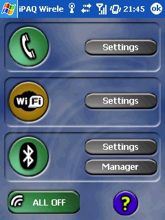 Vom Grundeindruck ist der iPAQ 6340 ein Mitglied der 22xxer-Serie. Für die Wireless-Funktionen hat er eine Antenne (wie damals der MDA1). Für viele mag das ein Argument dagegen sein, ich finde es für einen PDA mit integriertem Telefon vollkommen angemessen. Das schöne am 6340: Im Gegensatz zu anderen PDAs können alle Wireless-Funktionen parallel verwendet werden. Während im WLAN Mails abgefragt werden, kann über die GSM/GPRS-Einheit über ein Bluetooth-Headset telefoniert werden. Über eine integrierte Oberfläche lassen sich alle Funktionen Ein- bzw Ausschalten und konfigurieren.