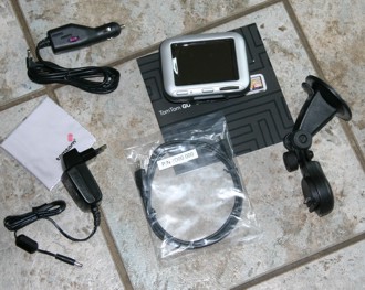 Im Paket befinden sich neben dem GO die CD mit dem Kartenmaterial für Deutschland und den Hauptstrassen Europas, eine Kfz-Halterung mit Saugnapf, ein USB-Datenkabel, eine 256MB SD-Karte mit dem vorinstallieren Kartenmaterial, ein Netzteil, ein Kfz-Ladekabel, ein Reinigungstuch für das Display und eine Tasche (bei den ersten Geräten liegt statt der Tasche ein Gutschein bei, die Tasche wird dann nach Registrierung des GO voraussichtlich im Spätsommer nachgeliefert). Die Verpackung selbst erinnert in ihrem Aufbau stark ein eine überdimensionierte iPOD-Verpackung, ist mehrfach aufklappbar und auseinander zu nehmen.
