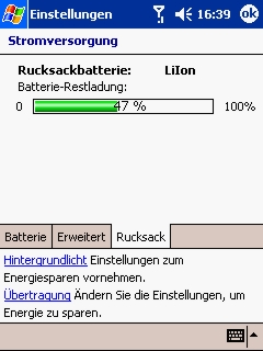 Der Zusatzakku wirkt sich auf die Gesamt-Standby- und Betriebszeit aus und verlängert diese in verschiedenen Tests um bis zu 50 Prozent. Dies ist natürlich abhängig von der eingelegten Karte und der Verwendung des Geräts, in jedem Fall aber ein willkommener Zugewinn an Unabhängigkeit von der Steckdose. Intelligent dabei gelöst: Erst wird der Akku des Backpacks leergesogen, erst dann wird auf den internen Akku umgeschaltet. Selbst wenn der Akku des Backpacks leer ist, funktiioniert (im Gegensatz zu den iPAQ-Jackets) der CF-Slot immer noch.