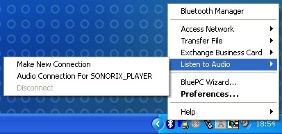 After scanning the bluetooth-neighborhood and pairing the headset (as it would be with any other bluetooth device) it is no problem to establish an audio-connection through the bluetooth settings. The standard audio output device is automatically set to the OBH-0100, which results in the complete sound from the PC being transferred to the OBH-0100. Start an MP§, and you´ll hear it streamed over the air in the OBH-0100.