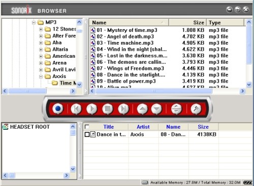 of the local PC, bottom part shows the track already stored in the headset). In the middle of that screen a little