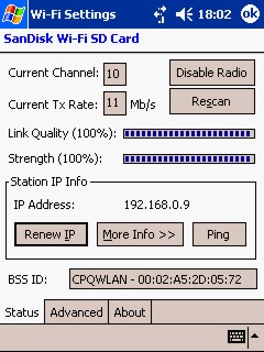 Bestellt (für USD 145,- plus USD 9,- Shipping) und innerhalb weniger als einer Woche hier, stellt sich die Karte nun dem Test. Die Installation ist extrem einfach, die beilegenden MiniCD wird eingelegt, die Treibersoftware gestartet (diese liegt für Pocket PC 2002 und Windows Mobile 2003 bei), nach einem Softreset kann die Karte dann in den IO-fähigen SD-Slot eingelegt werden, im Test in einen iPAQ rz1710. Wie bei einer internen WLAN-Schnittstelle wird automatisch nach Netzwerken gesucht, vorhandene werden angezeigt und bei Verschlüsselung wird der WEP-Key abgefragt. Im Normalfall ist damit alles erledigt!