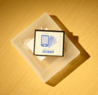 Nun gibt es für Palms schon lange Hardware-Extender, für Windows-CE-PDAs erst seit kurzem: Der CardonWare UltraMote Extender ist eine CF-Typ 2-Karte, die am aus dem PDA herausstehenden Ende zwei Infrarotdioden hat. Diese erweitern die Reichweite massiv, und sie haben noch einen weiteren Vorteil: durch die außenliegenden Dioden wird auch der abgedeckte Bereich erweitert, d.h. man muß nur in die grobe Richtung des Geräts deuten, um es bedienen zu können. In meinen Tests wurde eine Reichweite von 6 Metern niemals unterschritten, meist war es sogar mehr.