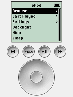 StarBrite Solutions haben jetzt mit dem pPOD einen Pocket PC-Simulator des iPODs auf den Markt gebracht, der schon nach kruzer Benutzung vergessen lässt, dass man sich nicht tatsächlich vor einem iPOD befindet, sondern der Pocket PC nur so tut. Das Design ist vollkommen identisch. Man kann sich in verschiedenen Oberflächen (im Standard Tag und Nacht) die Titel auf dem gesamten Pocket PC inklusive seiner Speicherkarten ansehen und anhören, manövriert mit dem Jogdial per Finger oder Stift hindurch, stellt lauter oder leiser, etc.